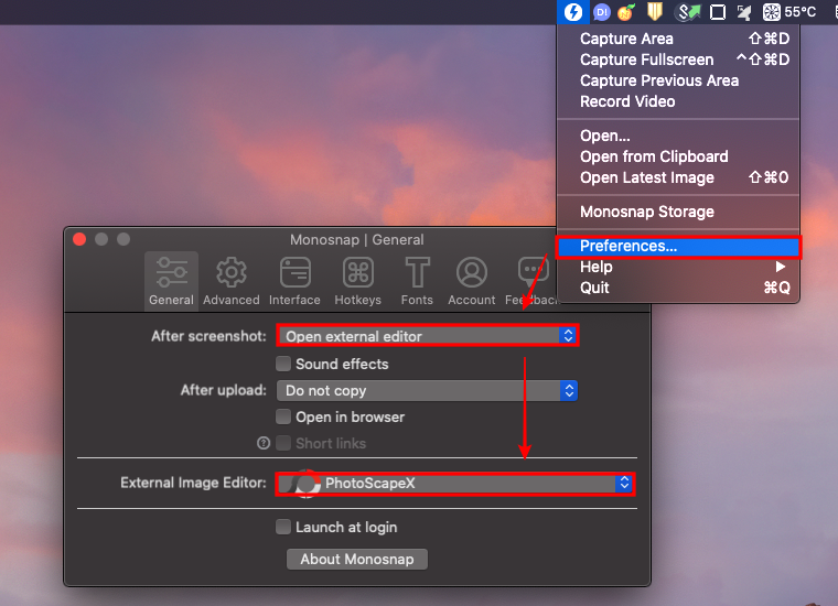 [General]에서는 스크린샷을 찍은 후 외부 프로그램으로 넘기기 위해 [Open external editor]를 선택한다.