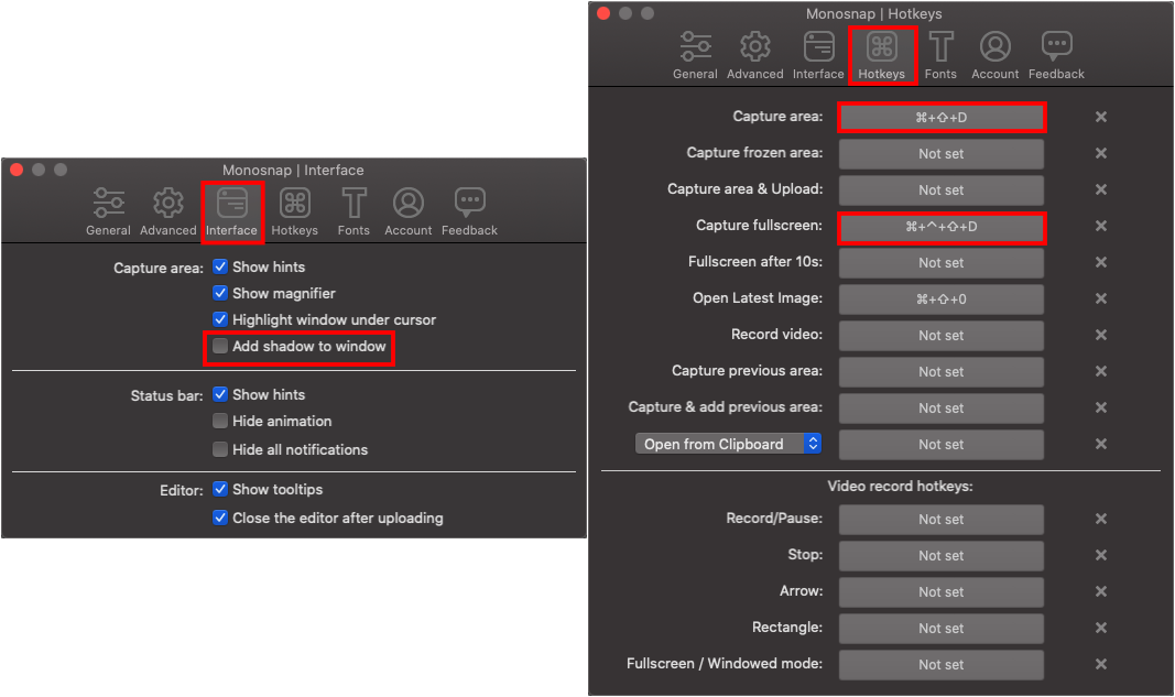 [Interface]에서는 [Add shadow to window]를 해제하여 캡쳐본의 그림자를 삭제한다.