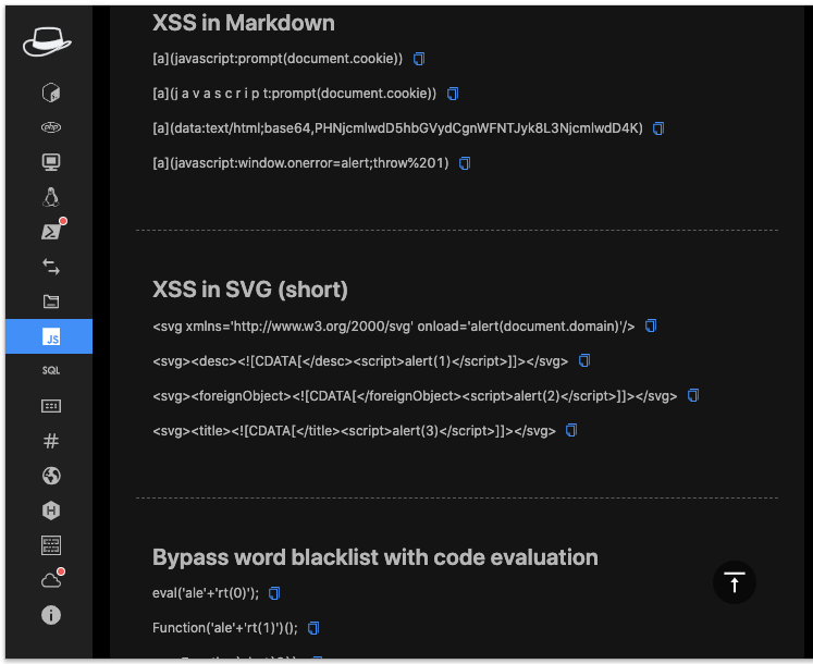 XSS 탭을 클릭하면 마크다운, SVG 등 각종 상황에 맞는 구문을 알려주며, 우회 방법도 알려준다.
